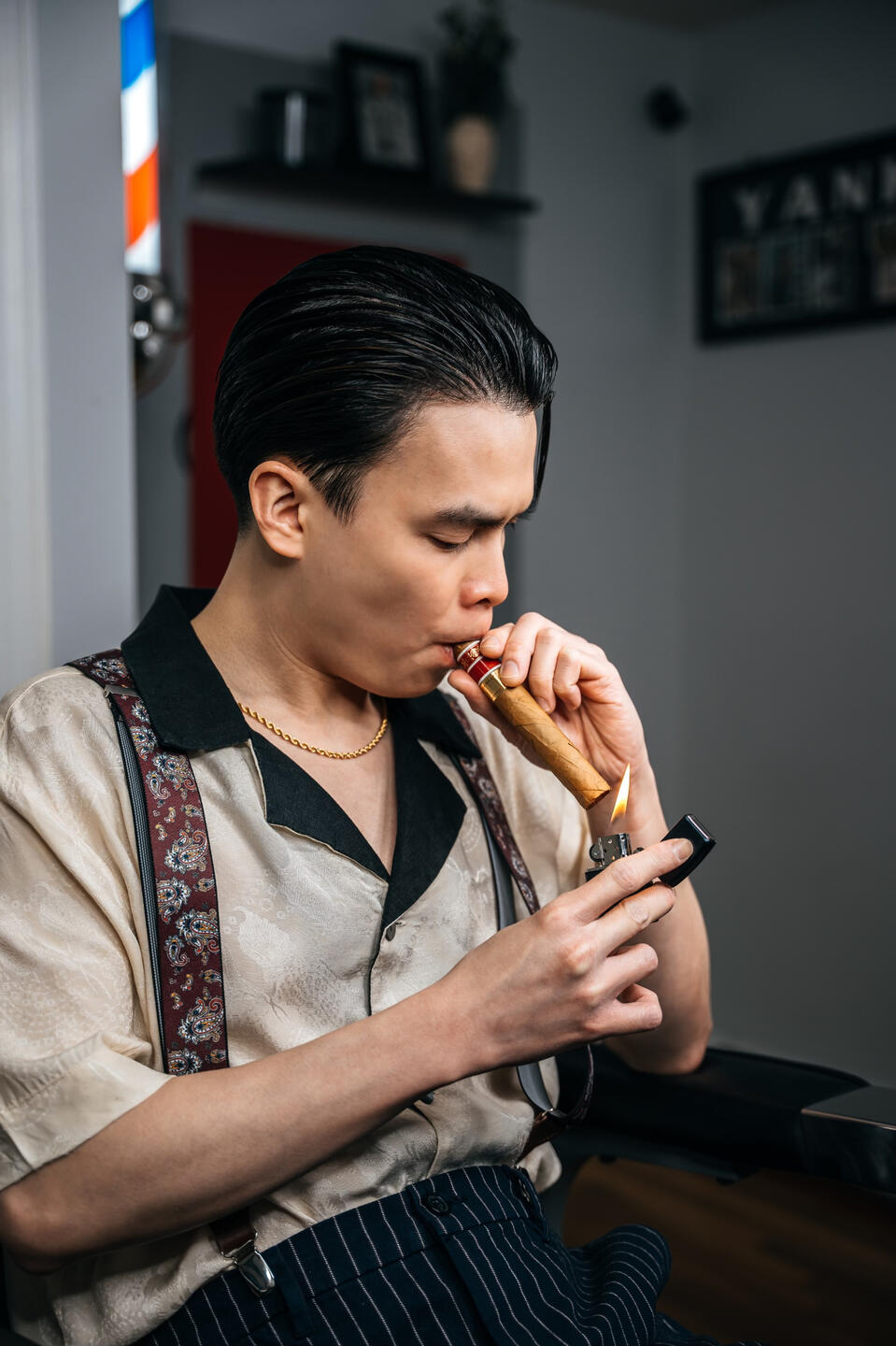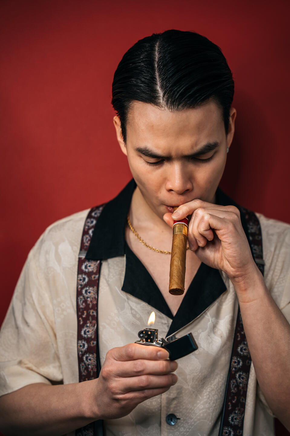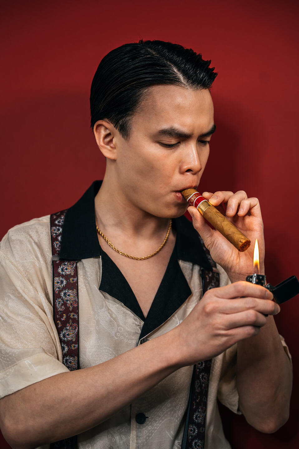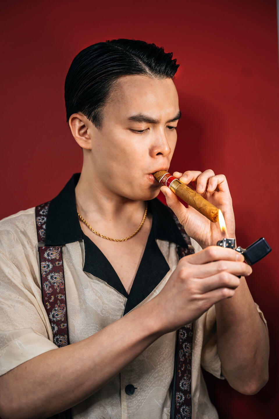 "With a refined taste for nostalgia, he selected a pair of trousers, a crisp dress shirt adorned with cufflinks, and suspenders that held together the ensemble with a touch of old-world charm, all while enjoying the rich flavor of his favorite cigar. In the quiet elegance of his preparation, he found himself in solitude beneath the soft glow of a crimson dawn."