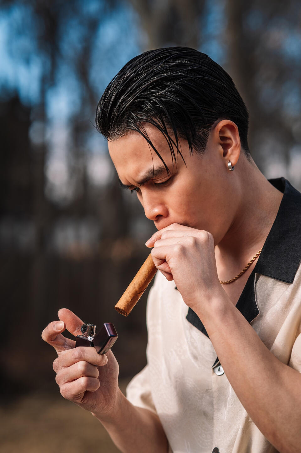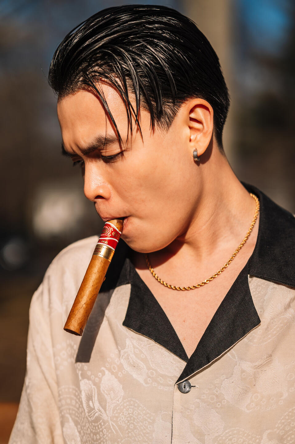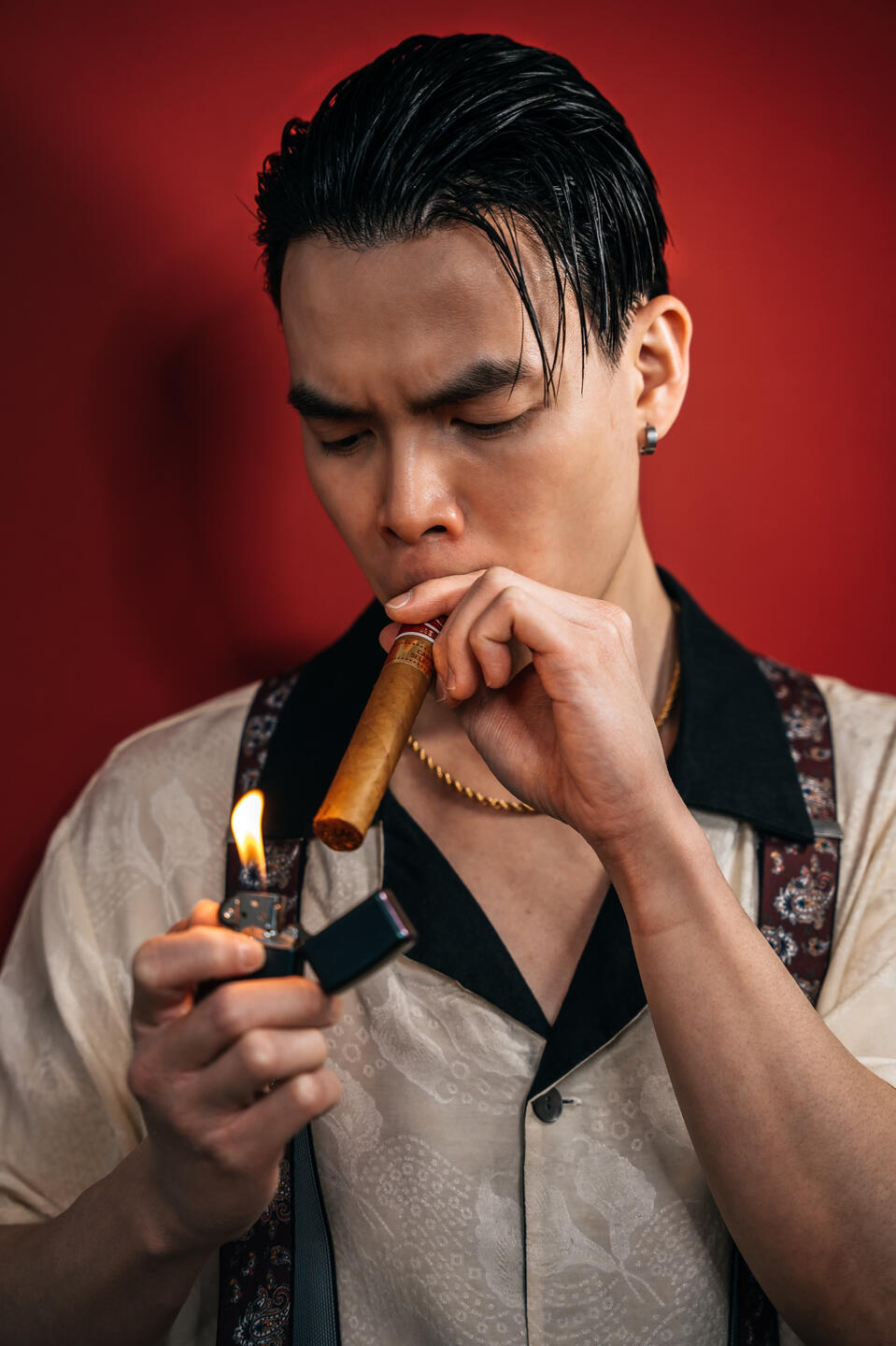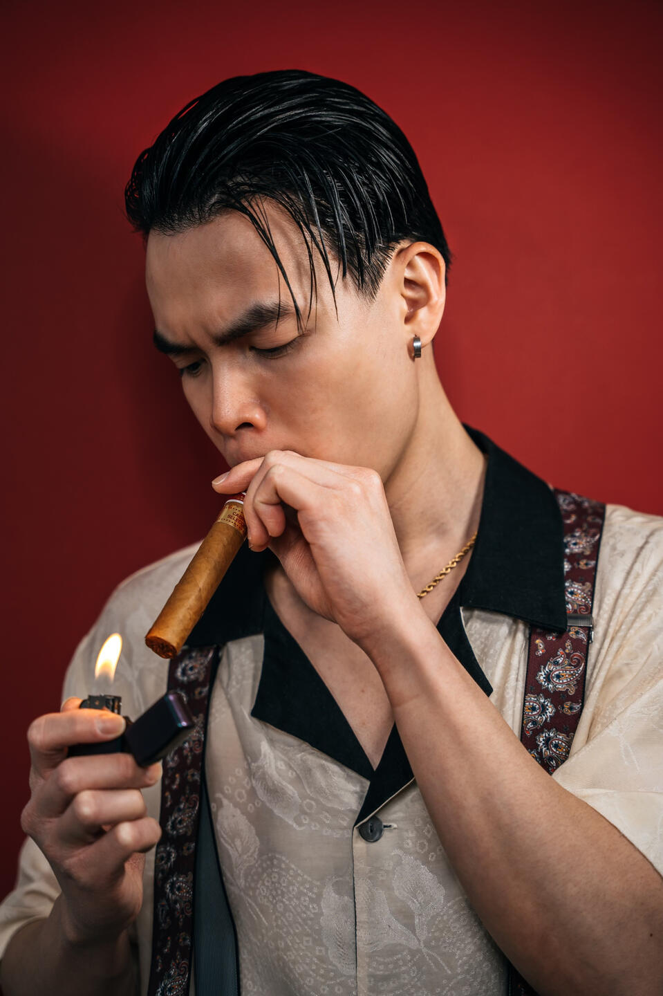 "With a refined taste for nostalgia, he selected a pair of trousers, a crisp dress shirt adorned with cufflinks, and suspenders that held together the ensemble with a touch of old-world charm, all while enjoying the rich flavor of his favorite cigar. In the quiet elegance of his preparation, he found himself in solitude beneath the soft glow of a crimson dawn."